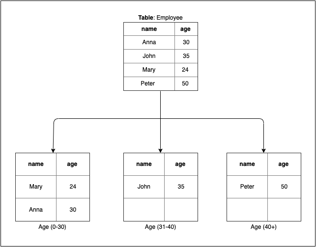 會根據某個 key 的範圍分區,key 的選擇非常重要,如果選擇不好,將會有分佈不均勻的問題,以上圖為例,年齡分為 0-30、30-40、>40,將會個別存在於不同資料庫。